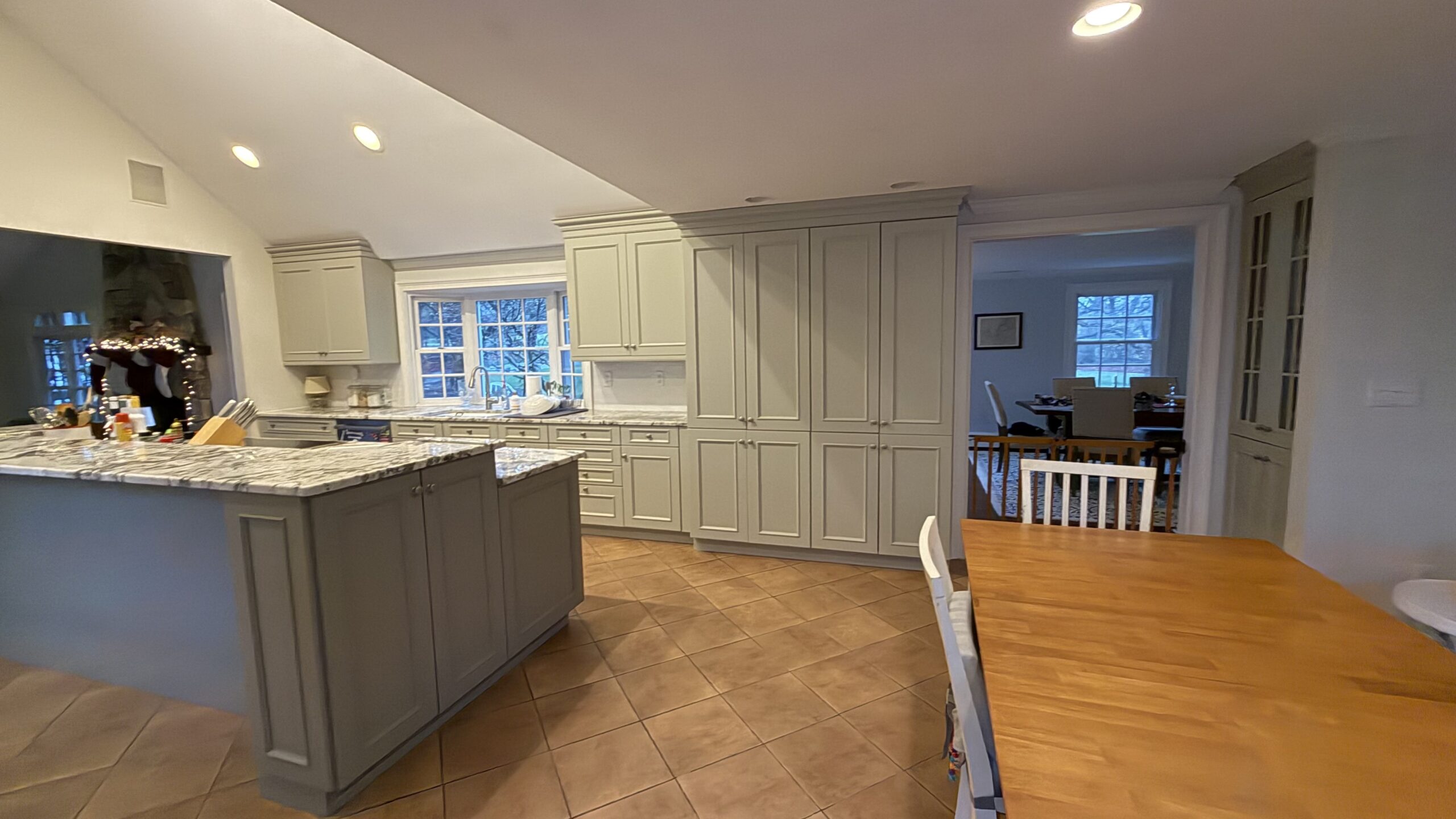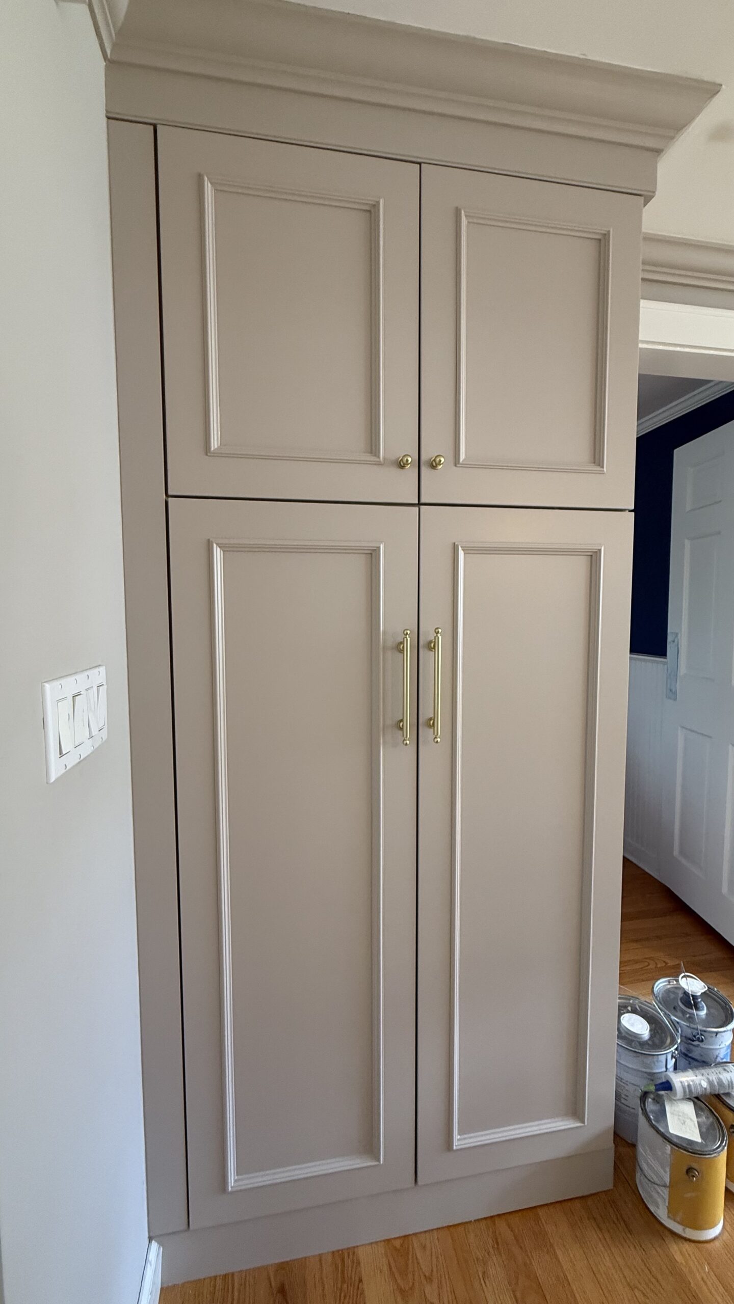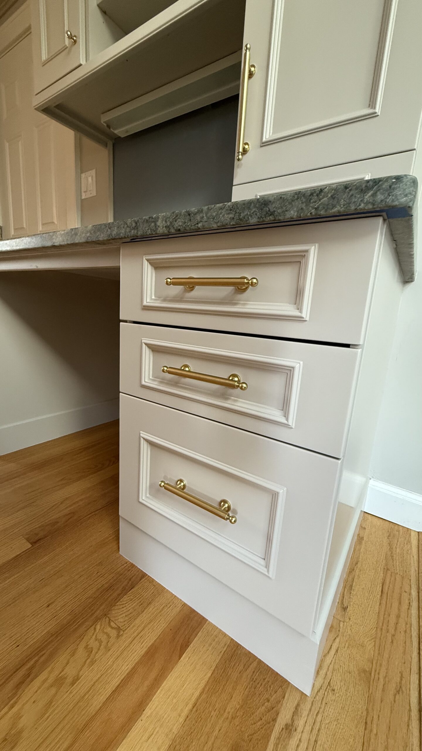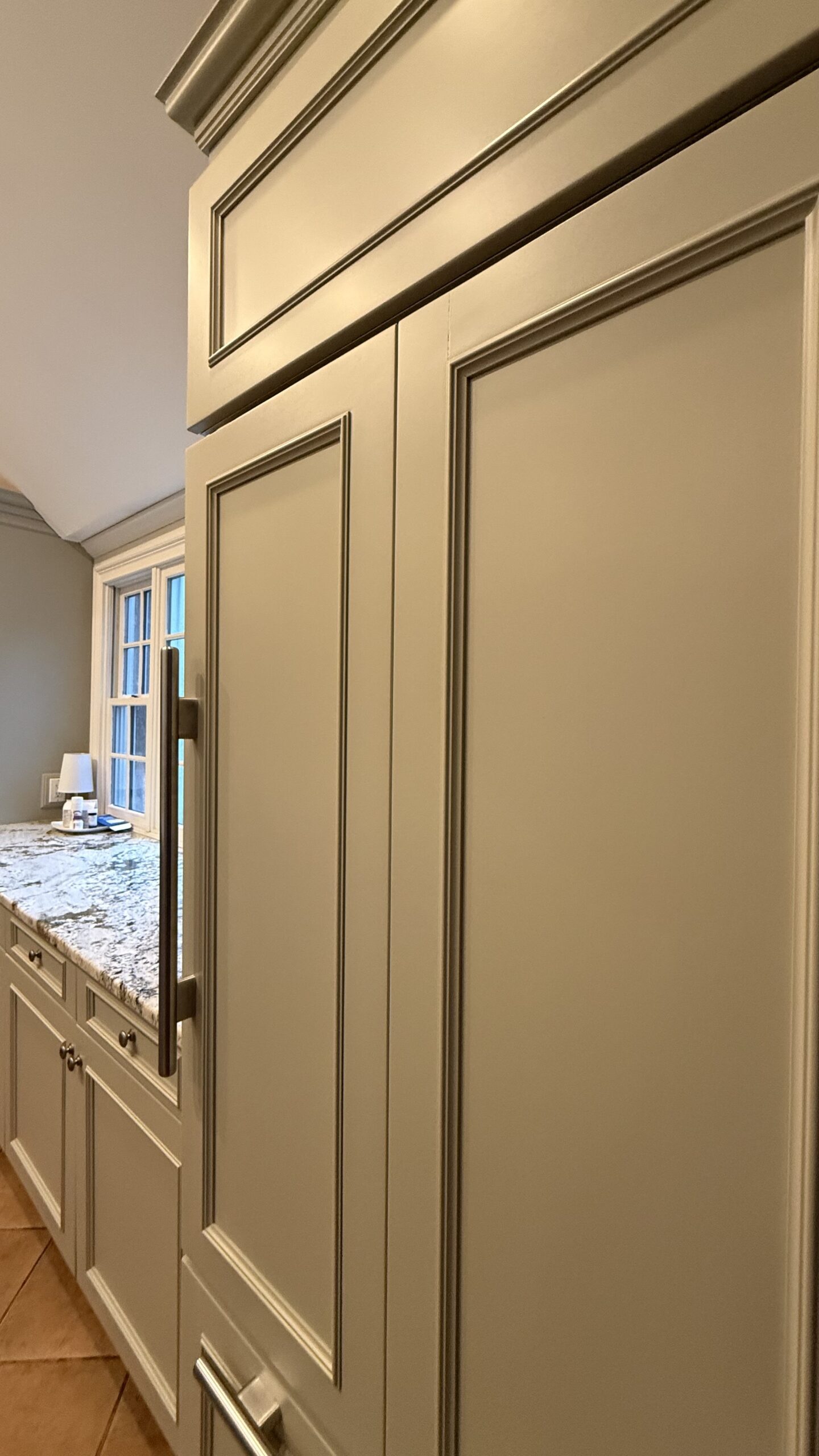 The cabinets were meticulously prepped, sanded, primed, and finished with the Milesi two-component polyurethane system (2K). The chosen color, Litchfield Gray, provides a warm, sophisticated, and on-trend neutral that complements a variety of design styles. Milesi paint is known for its exceptional durability, resistance to wear, and smooth, factory-grade finish. Bronze handles and knobs were added creating a layer of elegance and functionality.