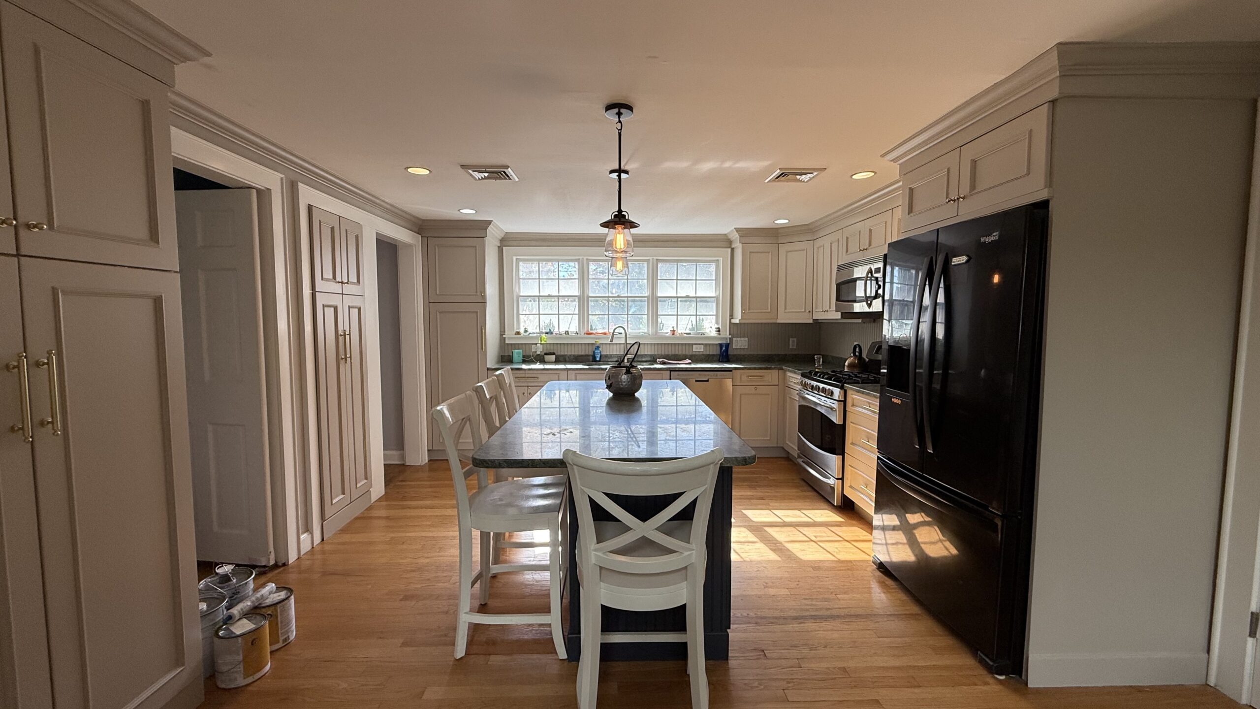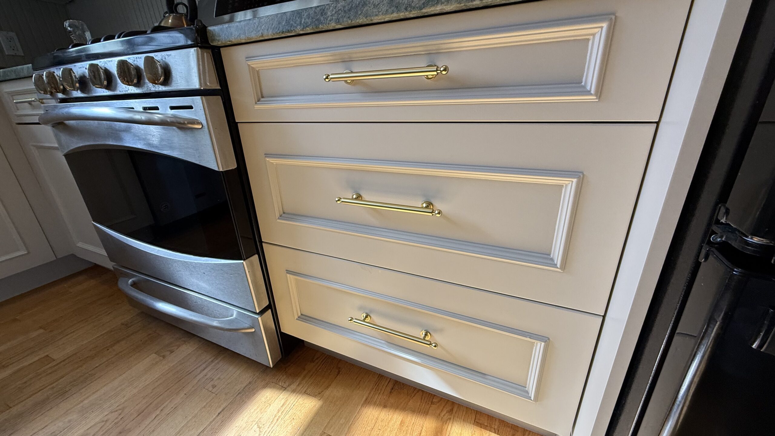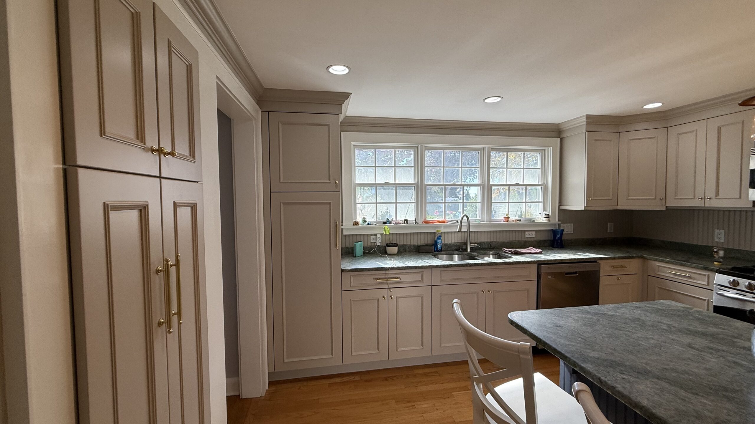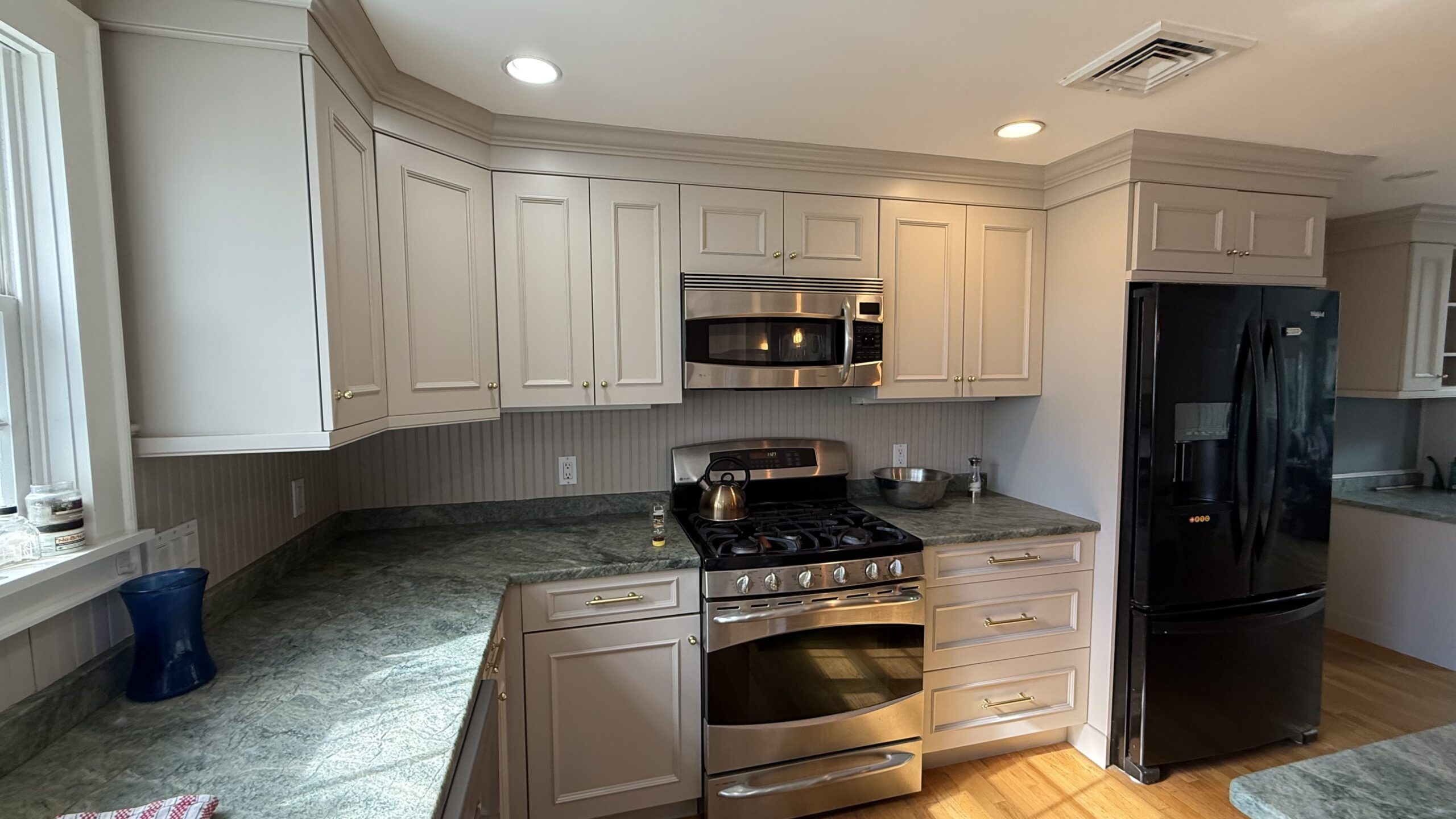 The cabinets were meticulously prepped, sanded, primed, and finished with the Milesi two-component polyurethane system (2K). The chosen color, Litchfield Gray, provides a warm, sophisticated, and on-trend neutral that complements a variety of design styles. Milesi paint is known for its exceptional durability, resistance to wear, and smooth, factory-grade finish. Bronze handles and knobs were added creating a layer of elegance and functionality.