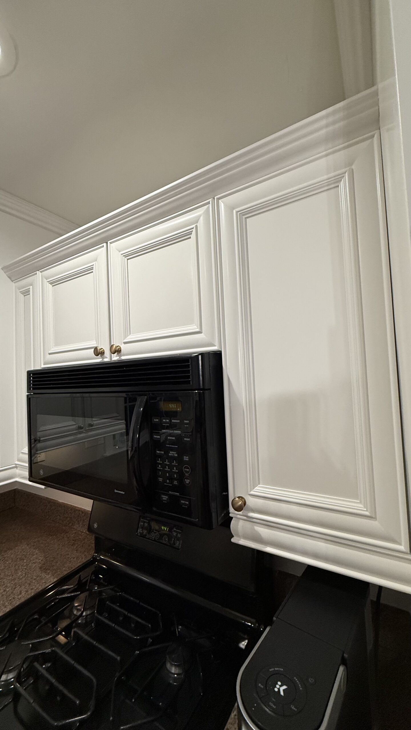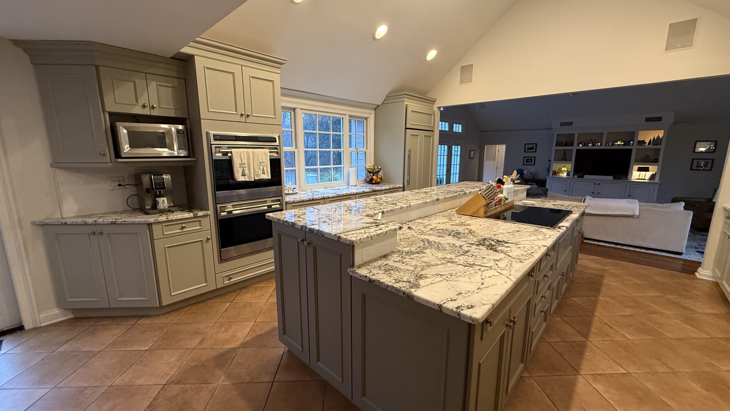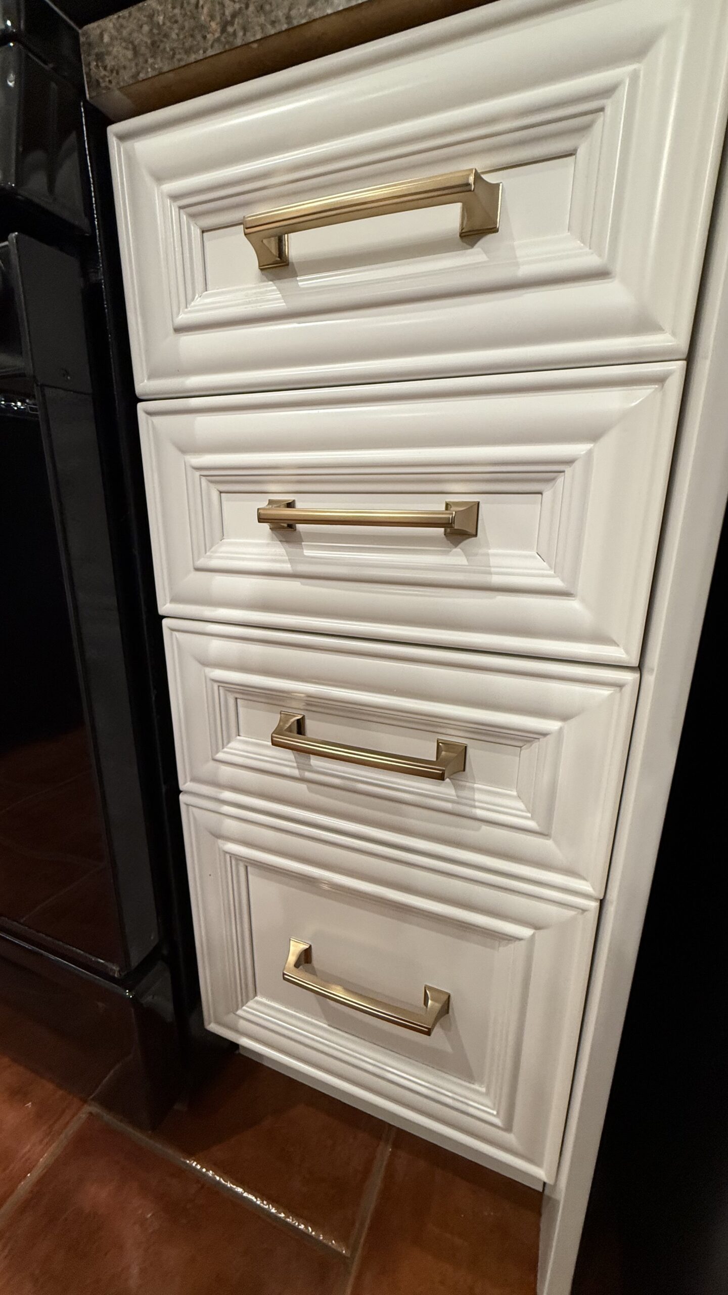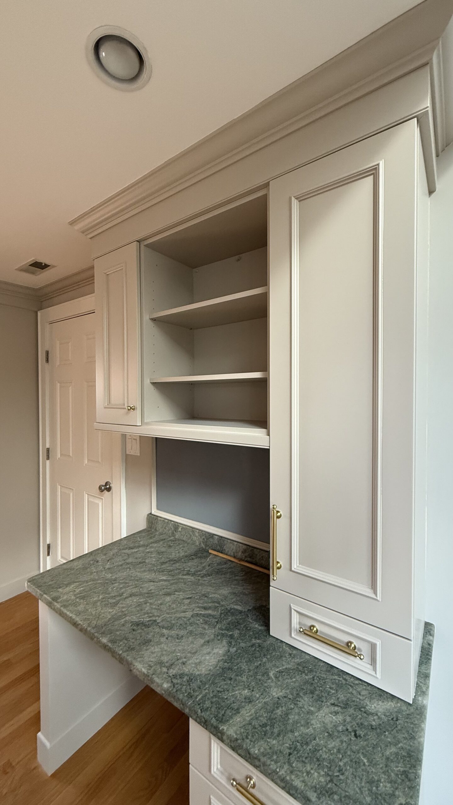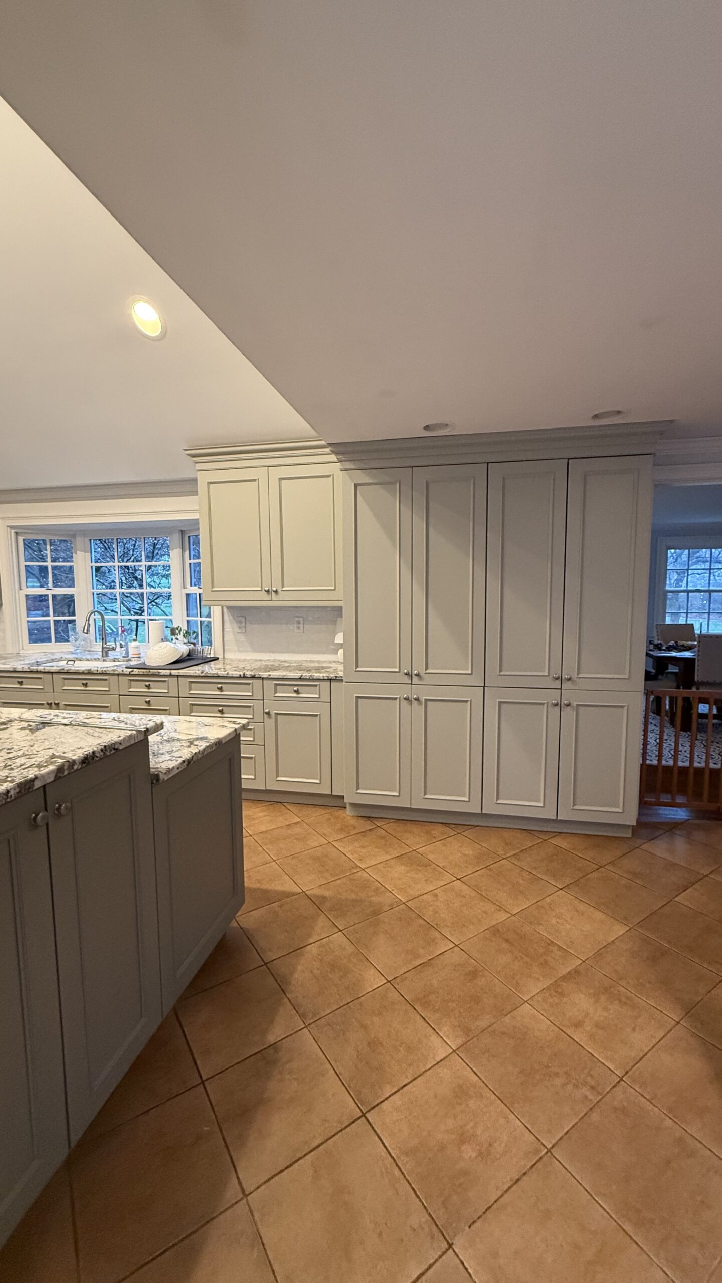 The cabinets were meticulously prepped, sanded, primed, and finished with the Milesi two-component polyurethane system (2K). The chosen color, Litchfield Gray, provides a warm, sophisticated, and on-trend neutral that complements a variety of design styles. Milesi paint is known for its exceptional durability, resistance to wear, and smooth, factory-grade finish. Bronze handles and knobs were added creating a layer of elegance and functionality.
