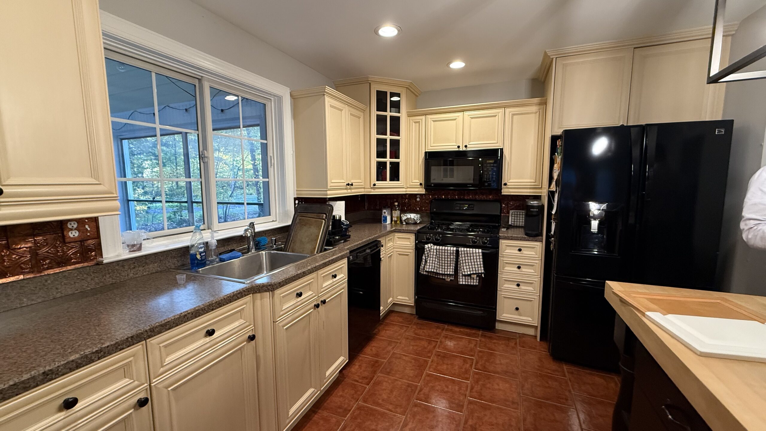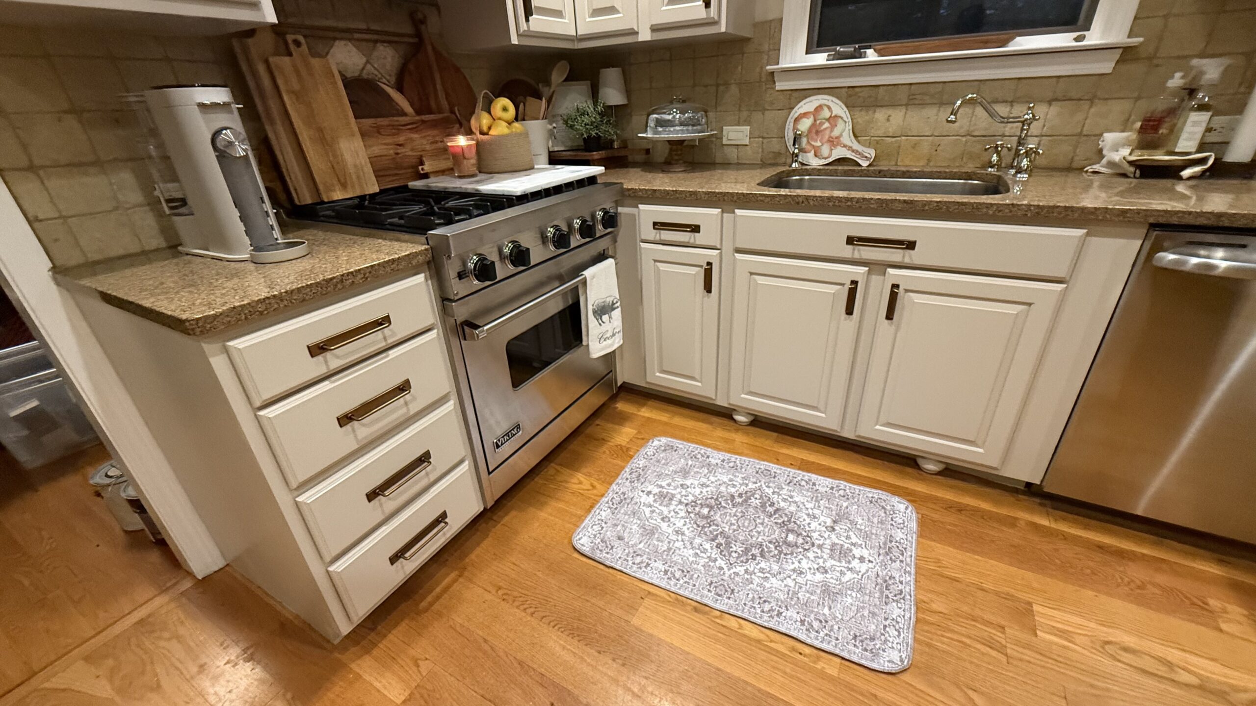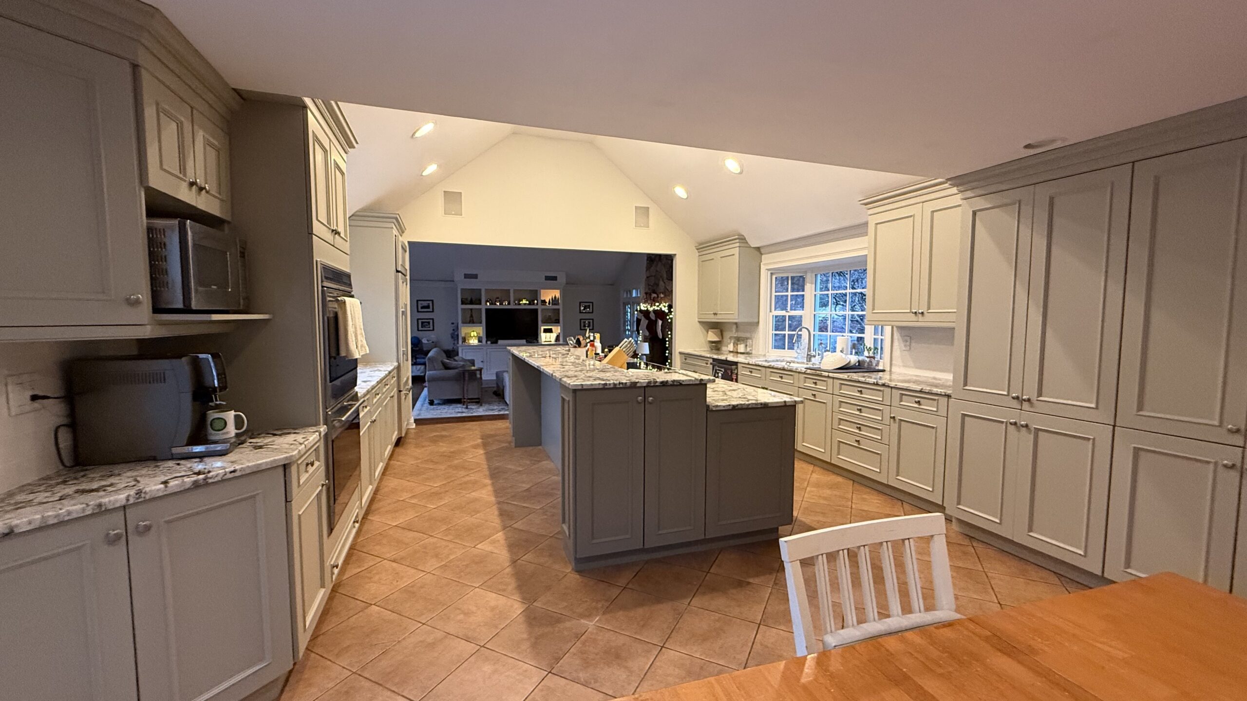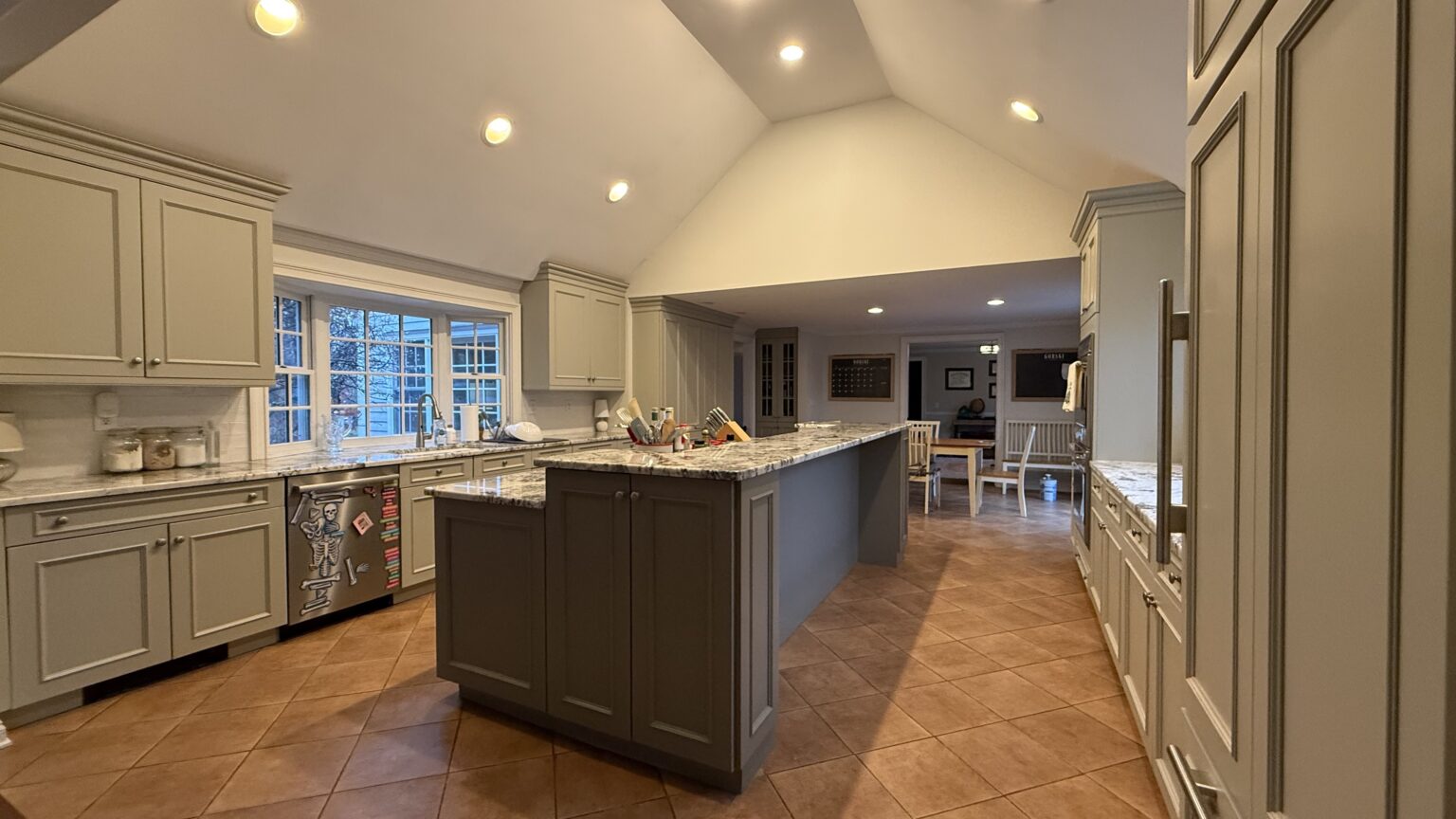 The cabinets were meticulously prepped, sanded, primed, and finished with the Milesi two-component polyurethane system (2K). The chosen color, Litchfield Gray, provides a warm, sophisticated, and on-trend neutral that complements a variety of design styles. Milesi paint is known for its exceptional durability, resistance to wear, and smooth, factory-grade finish. Bronze handles and knobs were added creating a layer of elegance and functionality.