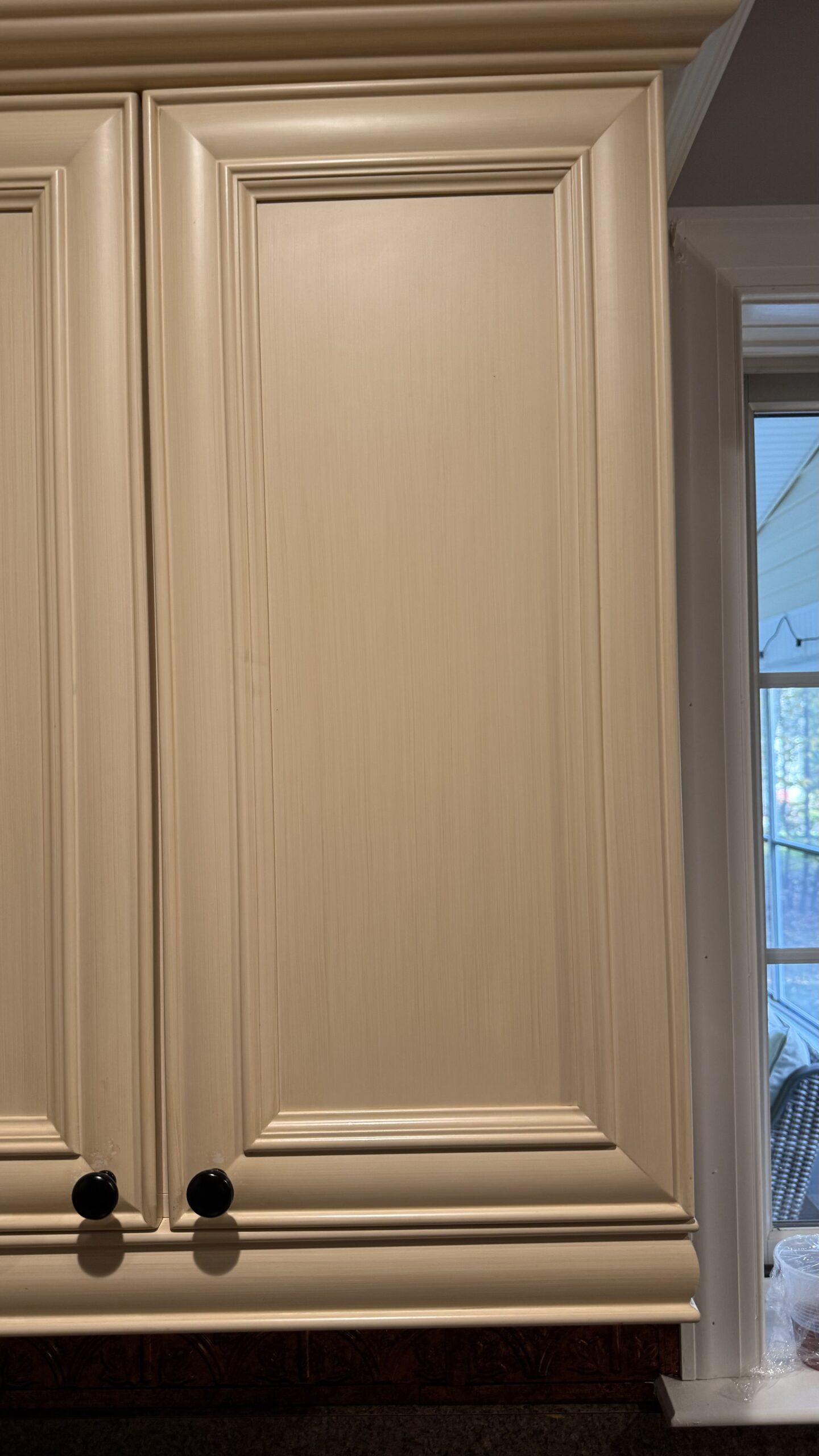 This kitchen had been painted over four times by brush and roll. It was definitely a challenge to level and smooth it out.