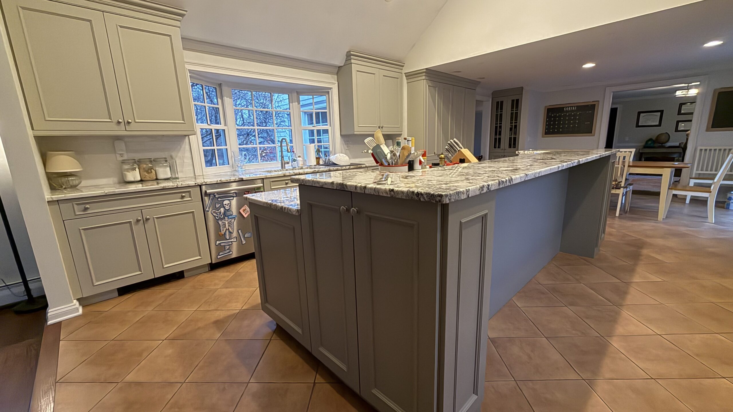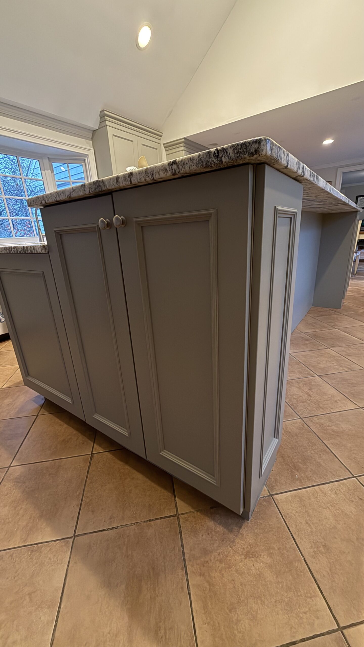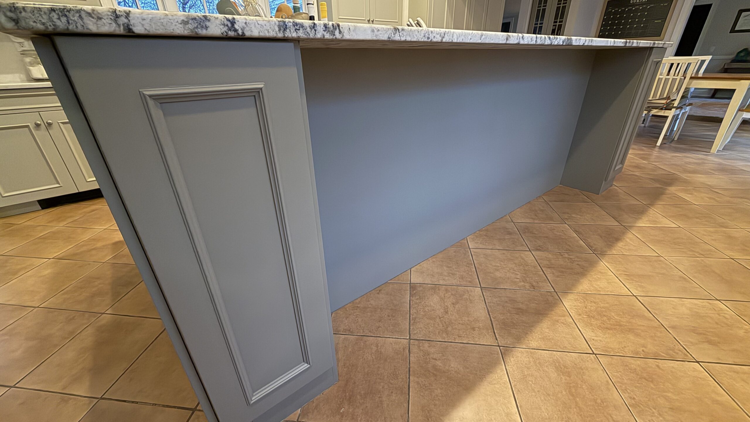 Cabinet refinishing done in Storm Gray by Benjamin Moore.